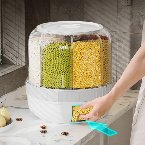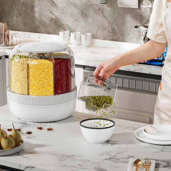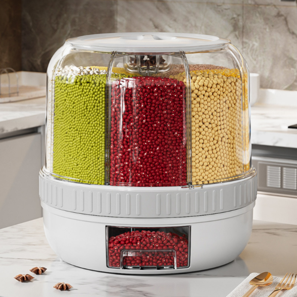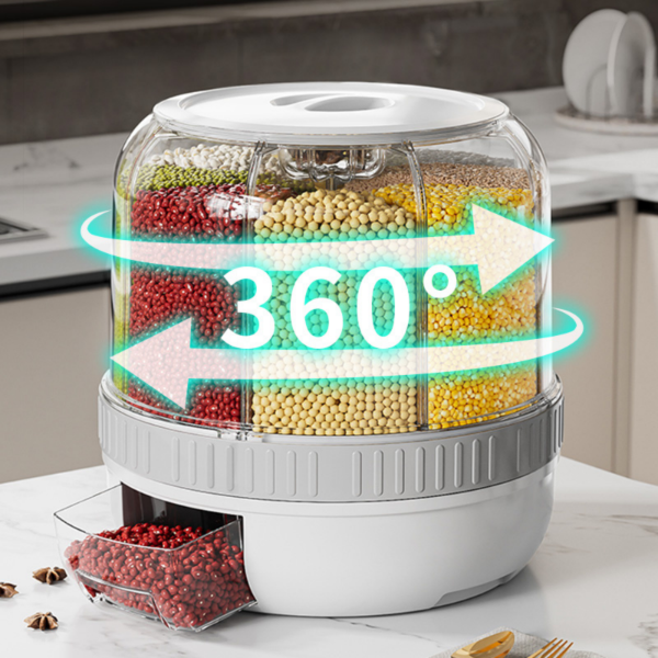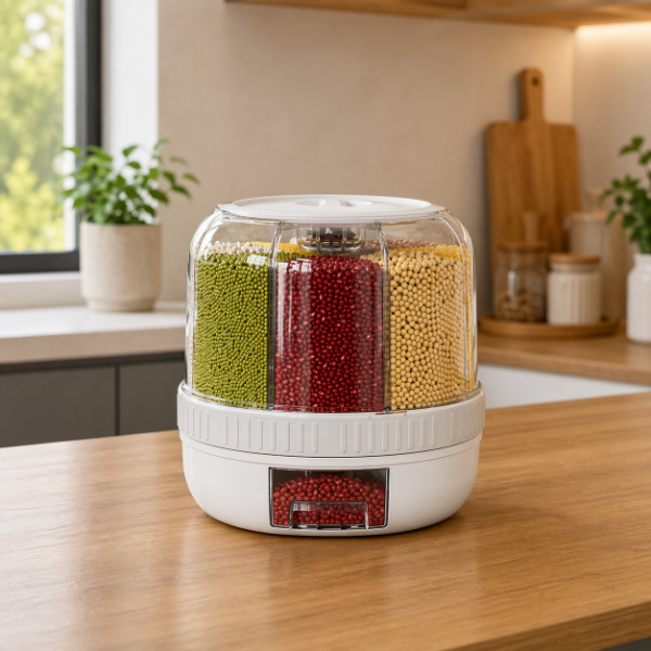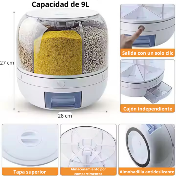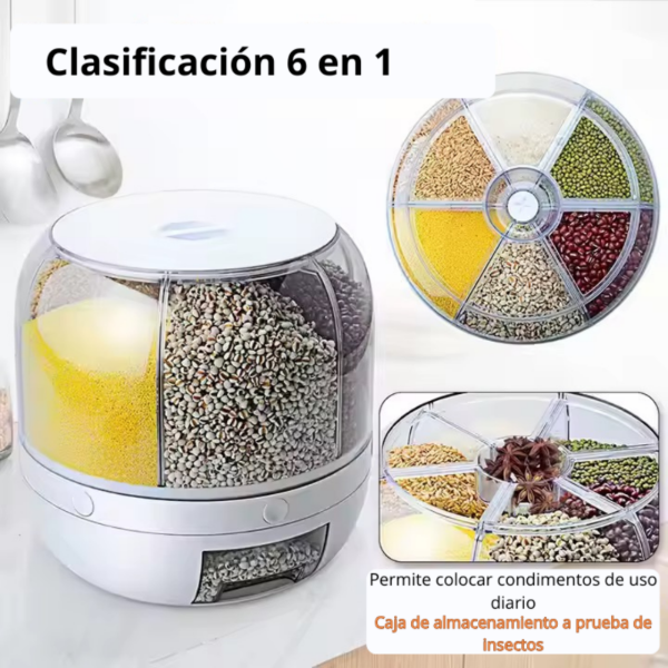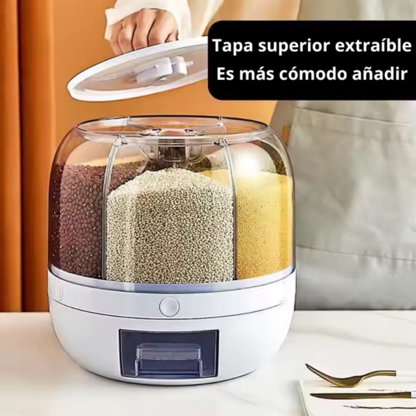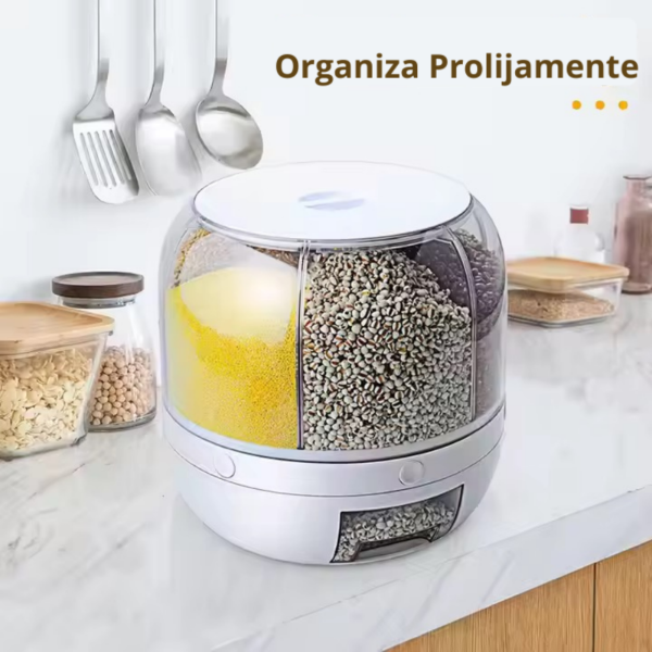 Mantené tu cocina más ordenada, práctica y funcional con este dispenser giratorio para granos y cereales, ideal para almacenar alimentos secos y tenerlos siempre al alcance.
