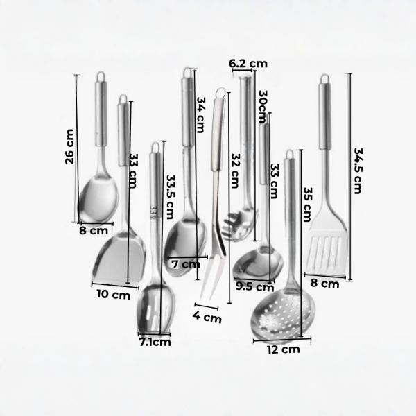 Equipá tu cocina con este juego de utensilios de cocina de 9 piezas, ideal para preparar, mezclar, servir, voltear y cocinar todo tipo de comidas de forma práctica y cómoda.