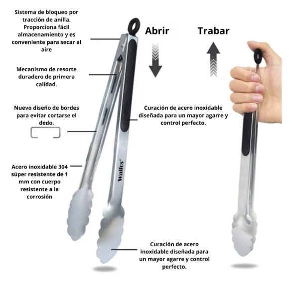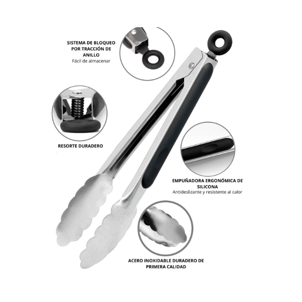 Cuenta con un sistema de bloqueo que permite mantener la pinza cerrada cuando no se usa, evitando aperturas accidentales y facilitando el guardado en cajones o colgada en la cocina.