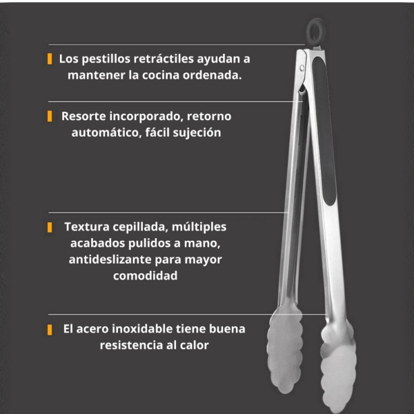 Esta pinza es un accesorio simple, útil y confiable para acompañarte en distintas tareas de cocina, desde servir comidas hasta manipular alimentos en la parrilla.