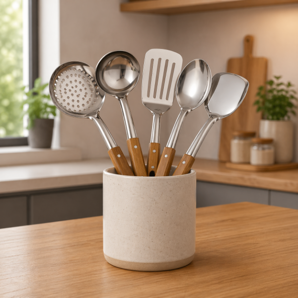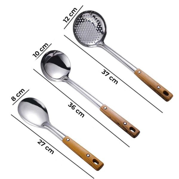 Incluye piezas esenciales como cucharones y espumaderas, pensadas para acompañarte en diferentes preparaciones y facilitar las tareas de cocina.