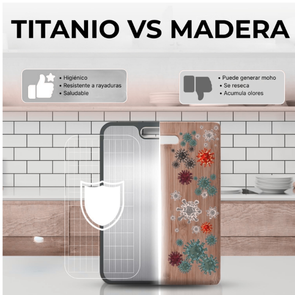 Su formato doble cara permite optimizar el espacio y utilizar una misma tabla para distintas tareas de cocina.