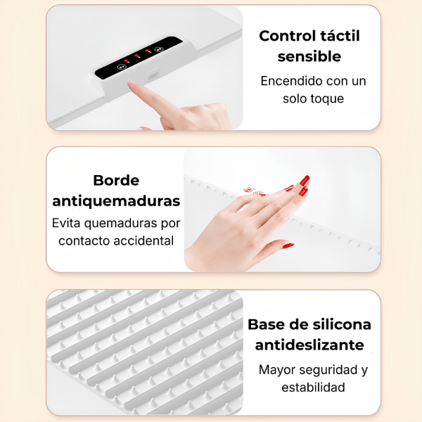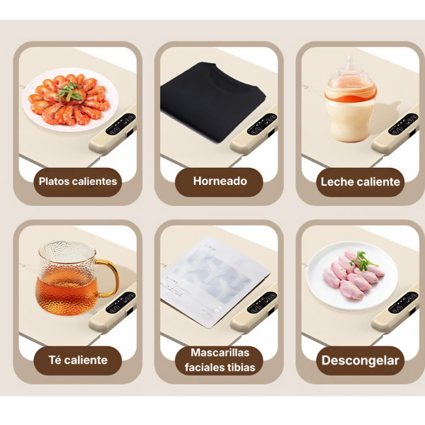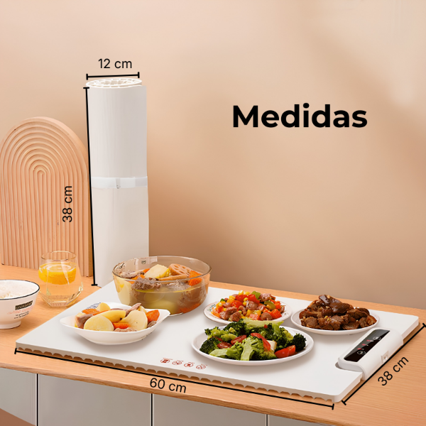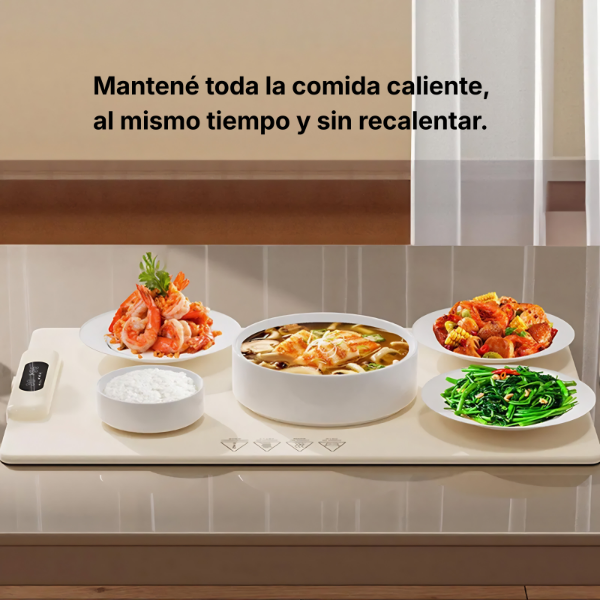 Funciona conectado a la corriente eléctrica y permite conservar la temperatura de platos, fuentes y recipientes, evitando tener que recalentar los alimentos constantemente.