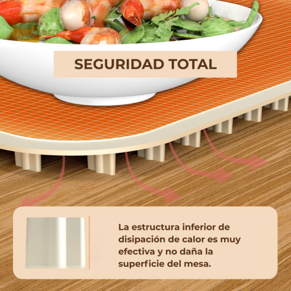 Su diseño flexible permite apoyarlo fácilmente sobre la mesa o mesada, brindando una superficie útil para mantener la comida caliente durante más tiempo.